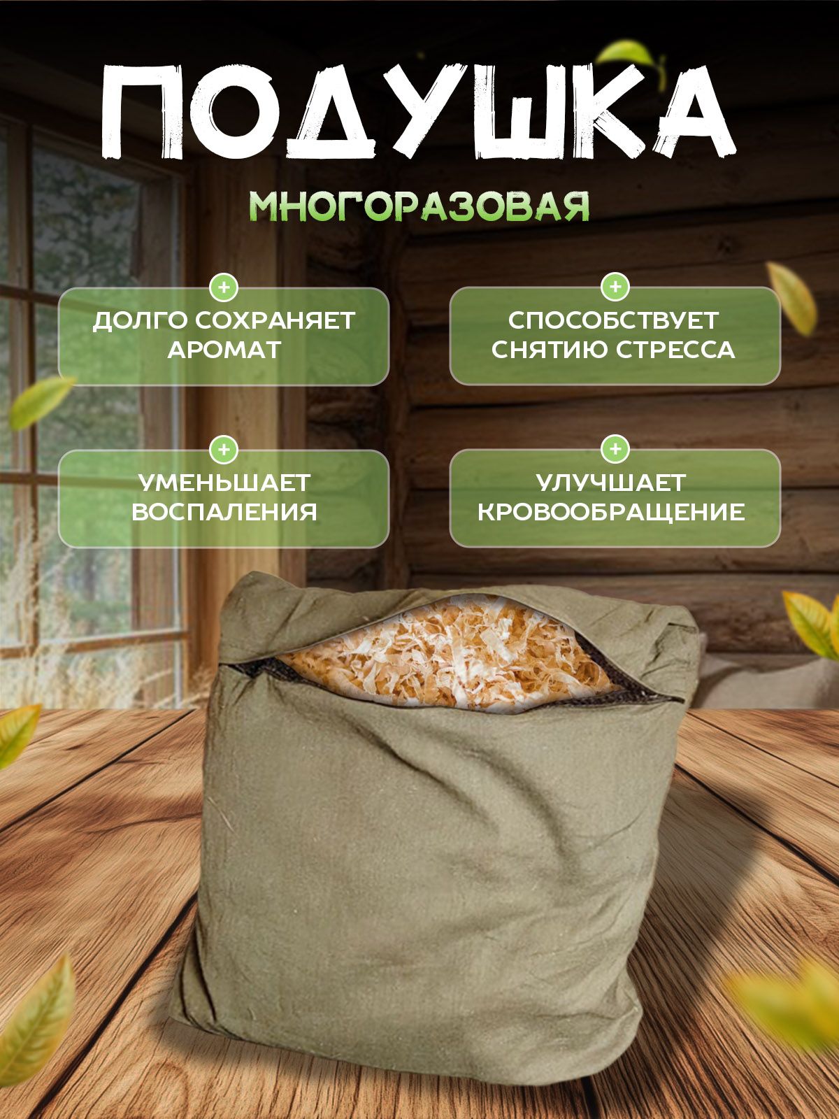 Подушка с кедровой стружкой занимает важное место и приносят пользу. Главное преимущество такой банной подстилки на полок — это удобство, комфорт и польза летучих и эфирных масел, выделяющихся из кедровой стружки. Эти масла благотворно влияют на кожу, лёгкие и нервную систему. Такие подушки помогают получить максимум пользы от банных процедур благодаря лучшему расслаблению, снятию мышечного тонуса, спокойствию и полному релаксу. Аромат стружки раскрывается при разных температурах, создавая эффект расслабления и охлаждения. Когда кедровый наполнитель подвергается воздействию высокой влажности и температуры в парной, он начинает раскрываться душистыми ароматами. Достаточно обдать подушку несколькими черпаками кипятка, и она начнёт благоухать, а также станет более воздушной и мягкой. После банных процедур не забудьте хорошо просушить подушку, оставив её в бане до полного высыхания.