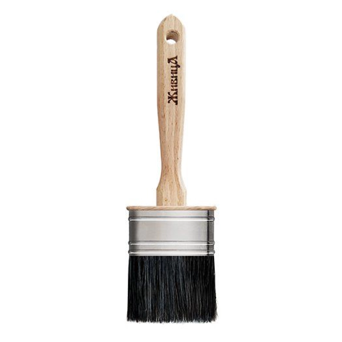 Размер - ширина 50 мм, максимальная толщина 30 мм. Овальная профессиональная кисть из натуральной черной щетины плотностью 90%.
